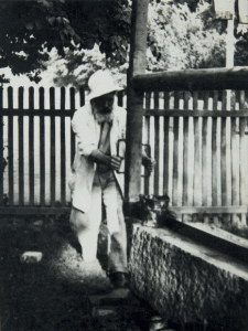 [BRANCUSI Constantin] - MICU Marcu. CONSTANTIN BRANCUSI TRAVAILLANT À LA PORTE DU BAISER. PHOTOGRAPHIE ORIGINALE. Targu jiu, 2 juillet 1938. 23,9 x 18,9 cm, sous encadrement.