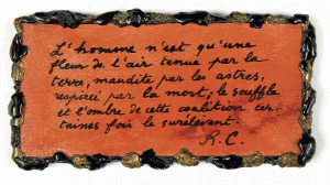 CHAR René - L'HOMME N'EST QU'UNE FLEUR DE L'AIR... APHORISME CALLIGRAPHIÉ sur une plaquette de bois, teintée rouge, encadrée de cire de couleur.