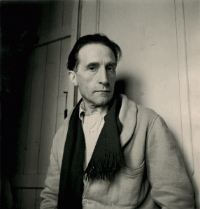 Tirage argentique postérieur de Denise Bellon représentant Marcel Duchamp de trois-quarts dans son appartement de la rue Larrey.