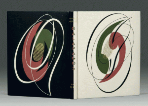 composition différente ovale mosaïquée de box vert et rose, filets et listels courbes de box noir ou blanc, dos orné du titre mosaïqué, onglets, doublure et gardes de daim blanc et noir, chemise, étui (Paul Bonet, 1959).