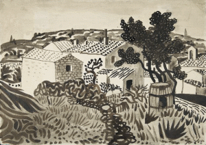 HUGO Jean - DESSIN À L'ENCRE ET LAVIS SIGNÉ. Circa 1950. 35 x 50 cm, sous encadrement. Dessin original à l'encre et lavis signé au recto par Jean Hugo, représentant un paysage de Provence.
