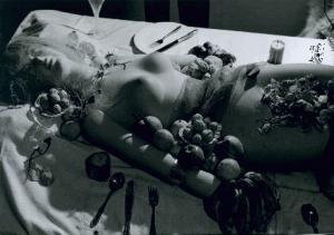 Tirage argentique postérieur de Denise Bellon représentant un mannequin allongé sur une table recouvert de victuailles pour l'Exposition Surréaliste de 1959 «Eros».