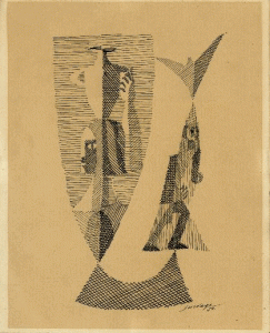 Dessin original daté et signé au recto par Survage représentant deux personnages réalisés à l'encre par des lignes horizontales et quadrillées.