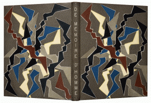 TZARA Tristan - PICASSO Pablo - DE MÉMOIRE D'HOMME. Paris, Bordas, 1950. In-4, plein maroquin vert kaki, illustré sur les deux plats d'un décor géométrique composé de pièces de maroquin et box bleues, jonquilles, fauves, gris souris et noir.