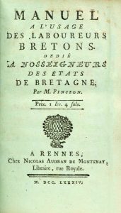 [BRETAGNE]. PINCZON (Julien Joseph). Manuel à l’usage des laboureurs bretons […]. À Rennes, Chez Nicolas Audran de Montenay, Libraire, 1784. In-12, basane mouchetée, dos lisse orné « à la grenade » (reliure de l’époque).