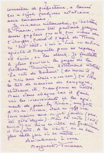 Elle s’excuse de n’avoir pas répondu plus tôt à ses courriers ; (…) Mes raisons sont comme toujours la complication de l’existence dont vous connaissez trop les mauvais effets pour que j’aie à vous les décrire (…). Elle accepte la présidence d’honneur qui lui est offerte pour l’exposition, mais sa venue en Europe est encore incertaine ; Quant à la médaille d’honneur de la ville de Lille et sa citoyenneté, je serai plus qu’honorée de les recevoir et vous prie de remercier le député-maire (… ). Elle écrit à Natalie Dumez dont ces notes sur le Mont- Noir l’ont grandement intéressée ; La plupart des faits m’étaient connus, sauf toutefois le nom de la rue où ma famille habitait l’hiver à Bailleul (…). Je vais passer cette information à mon neveu Georges de Crayencour passionné d’histoire locale (…). Elle travaille en ce moment dans le volume appelé provisoirement « Le Labyrinthe du monde » mais qui s’intitulera peut-être, plutôt, tout simplement, « Archives du Nord », à la Révolution de 48 à Lille (…). Mon grand-père alors jeune conseiller de préfecture, a laissé sur ce sujet quelques notations assez curieuses. Elle désespère de trouver en France un « bon hôtel », c’est-à-dire un endroit agréable et tranquille pour se reposer ou écrire, ou les deux. Je feuillette le plus souvent les pages de la brochure touristique sobrement intitulée « La route du Bonheur » (…) qui donne la liste de maisons de campagne, châteaux, etc. transformés en hôtels. Mais dans chaque cas, il faut voir les inconvénients et les agréments de près (…). A la vérité, on ne sait plus nulle part où se mettre (…).