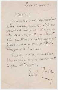 Il remercie son correspondant de ses renseignements ; (…) Je me permettrai un jour d’user de votre offre obligeante en allant voir fonctionner votre appareil (… ). Il aura soin de le prévenir deux jours à l’avance.