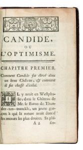 [VOLTAIRE - Candide ou l’Optimisme. Traduit de l’allemand de Mr. le Docteur Ralph. S. l., 1759]. In-12, veau, dos à nerfs orné, pièce de titre (reliure de l’époque).