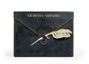En feuilles, in-8, sous étui portefeuille en cuir noir surpiqué de l vert olive, fermé par une plume.