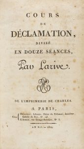 1804. - LIBRO : (ARTES ESCÉNICAS). - LARIVE, PAU : COURS DE DÉCLAMATION, DEVISÉ EN DOUZE SÉANCES. Paris : Ed. Delaunay, 1804. 8º mayor. 1 h. +334 p. +1 h.