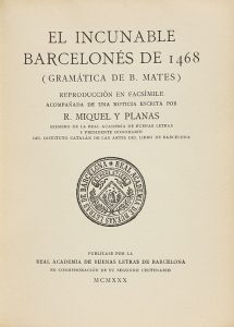 1930. - LIBRO : (BIBLIOFILIA). - MIQUEL Y PLANAS, R.: EL INCUNABLE BARCELONÉS DE 1468. (Gramática de B. Mates). - Barcelona : Academia de buenas letras de Barcelona, 1930. 8º menor. 3 h. + 51 p. + 60 h. de facsímil.