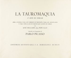 Edición numerada de 220 ejemplares de un total de 250. Picasso a finales de los años cincuenta asistió a una corrida de toros de Arles. Fue allí donde realizó las ilustraciones de este libro solamente en tres horas. En ellas se representan las tres fases de la corrida clásica presentadas muchas veces en formas esquemáticas. También influenciadas por Goya, Fortuny y Casas entre muchos.