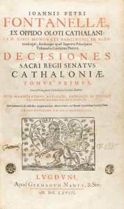 1668. - LIBRO : (CATALUNYA-DERECHO). - FONTANELLAE, IANNIS PETRI : DECISIONES SACRI REGII SENATUS CATHALONIAE. Lugduni [Lyon] : apud Germanum Nanty, 1668. 2 vol. en folio. I : 14 h. + 576 p., 33 h. ; II : 10 h. 642 p., 60 h.