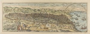 1700 ca. - GRABADO : BRAUN, G. ; HOGENBERG, F. : BARCELONA. BARCINO purlcherrima citerioris Hispaniae civitas... Grabado coloreado. 20,5 x 50,5 cm.