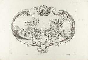 FIUME D´ARNO IL DI XXV DI LUGLIO 1619 ; SIN TITULO (ESCENA ARISTOCRATA-CAMPESTRE). - 4 grabados al cobre, planchas 22,5 x 29,5 cm, papel 27,5 x 40,5 cm.
