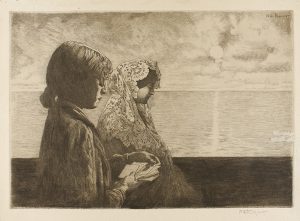 1890 ca. - GRABADO : RIQUER, ALEXADRE DE : CONJUNTO DE 2 GRABADOS : ESTUDIO DE CARAS DE NIÑOS ; DOS MUJERES FRENTE AL MAR. El primero en sepia, el otro en negro. Plancha 19,5 x 29,5 cm, papel 22 x 31, cm.
