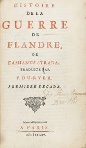 1665. - LIBRO : (HISTORIA). - STRADA, FAMIANUS : HISTOIRE DE LA GUERRE DE FLANDRE. Trad. P. Du-Ryer. París : suivant Copie imprimée, 1665. 8º. 4 h. (incluida portada a dos tintas y retrato grabado de Carlos V) + 722 p. + 13 h. de tablas.