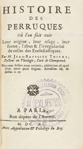 1690. - LIBRO : (HISTORIA). - THIERS, JEAN-BAPTISTE : HISTOIRE DES PERRUQUES OU L´ON FAIT VOIR. Paris : Aux dépens de l´auteur, 1690. 8º menor. 12 h. + 544 p., 1 h.