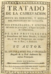1784. - LIBRO : (HISTORIA CATALUNYA). - TOS Y URGELLES, JAIME : TRATADO DE LA CABREVACION SEGUN EL DERECHO, Y ESTILO DEL PRINCIPADO DE CATALUÑA. Sus utilidades, y efectos, del modo de principar, y seguir las causas de cabrevación. DE LOS...