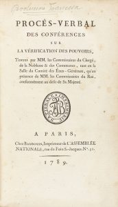 1789. - LIBRO : (REVOLUCIÓN FRANCESA). - PROCÈS-VERBAL DES CONFÉRENCES SUR LA VÉRIFICATION DES POUVOIRS, TENNUES PAR MM. les Commissaires du Clergé. París : Imp. l´Assemblée Nationale, 1789. 8º mayor. 2 h. + 216 p.