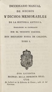 1794. - LIBRO : (HISTORIA). - CALZADA, BERNARDO MARIA DE : DICCIONARIO MANUAL DE HECHOS Y DICHOS MEMORABLES DE LA HISTORIA ANTIGUA. Madrid : Imp. Real, 1794. 3 vol. en 8º. I : 4 h. + 455 p. II : 321 p. III : 398 p. + 1 h. Viñeta de...