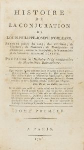 1796. - LIBRO : (HISTORIA). - MONTJOIE, C. L. F. : HISTOIRE DE LA CONJURATION LOUIS- PHILIPPE- JOSEPH D´ ORLÉANS. París : S. Imp. , 1796. 3 vol. en 8º.
