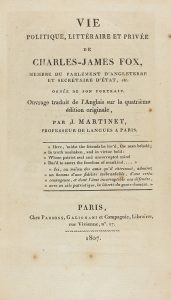 1807. - LIBRO : (HISTORIA). - VIE POLITIQUE, LITTÉRAIRE ET PRIVÉE DE CHARLES-JAMES FOX, MEMBRE DU PARLEMENT D´ ANGLATERRE ET SECRÉTAIRE D´ÉTAT, ETC. Traducción de J. Martinet. París : Lib. Parsons, Cagliani, 1807. 8º mayor. XIV + 324...