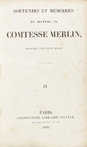 1836. - LIBRO : (HISTORIA). - MERLIN : SOUVENIRS ET MÉMOIRES DE MADAME LA COMTESSE MERLIN. París : Lib. Charpentier, 1836. 4 vol. en 8º.