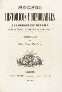 1846. - LIBRO : (HISTORIA). - BORDAS, LUIS : HECHOS HISTÓRICOS Y MEMORABLES ACAECIDOS EN ESPAÑA DESDE LA ÚLTIMA ENFERMEDAD DE FERNANDO VII HASTA LA CONCLUSIÓN DE LA GUERRA DE LOS SIETE AÑOS. Barcelona : Imp. Hispana, 1846. 8º mayor.