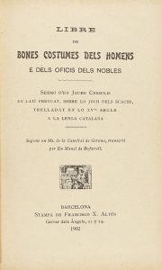 1902. - LIBRO : (HISTORIA). - CESSULIS : LLIBRE DE BONES COSTUMES DELS HOMENS E DELS OFICIS DELS NOBLES. SERMÓ D´EN JAUME CESSULIS... Barcelona : Stampa de Francisco X. Altés, 1902. 8º menor. 119 p.