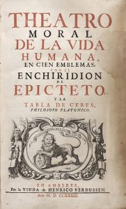1733. - LIBRO : (FILOSOFIA). - VEEN, OTTO VAN : THEATRO Moral de la Vida Humana, en cien emblemas ; con el Enchiridon de Epicteto y la Tabla de Cebes, Philosofo Platónico. Amberes : Viuda de Henrico Verdussen, 1733. Folio (35,5 x 24 cm). -