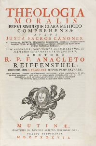 1737. - LIBRO : (HUMANIDADES). - REIFFENSTUEL, ANACLETO : THEOLOGIA MORALIS BREVI SIMULQUE CLARA METHODO COMPREHENSA ATQUE JUXTA SACROS CANONES. Veneti : Jo Baptistae Albritii, Hieronymi filii, 1737. Folio mayor. 10 h. + 564 p.