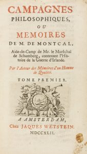 1742. - LIBRO : (FILOSOFÍA). - MONTCAL, M. DE : CAMPAGNES PHILOSOPHIQUES, OU MÉMOIRES DE M. DE MONTCAL, AIDE-DE-CAMP DE MR. LE MARÉCHAL DE SCHONBERG, CONTENANT L´HISTOIRE DE LA GUERRE D´IRLANDE. Amsterdam : Imp. Jaques Wetstein, 1742....