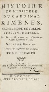 1746. - LIBRO : (INQUISICION). - MARSOLIER : HISTOIRE DU MINISTERE DU CARDINAL XIMENES, ARCHEVESQUE DE TOLEDE ET REGENT D´ESPAGNE. Paris : chez Chardon, 1744. 2 vols. en 8º menor. I : 465 p., 3 h. II : 398 p.