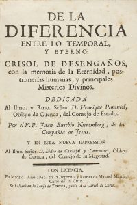 1762. - LIBRO : (HUMANIDADES). - NIEREMBERG, JUAN EUSEBIO : DE LA DIFERENCIA ENTRE LO TEMPORAL Y ETERNO : CRISOL DE DESENGAÑOS, CON LA MEMORIA DE LA ETERNIDAD, POSTRIMERÍAS HUMANAS, Y PRINCIPALES MISTERIOS DIVINOS. Madrid : Imp. Manuel...