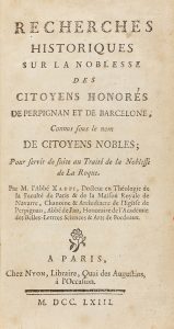 1763. - LIBRO : (HUMANIDADES). - XAUPI : RECHERCHES HISTORIQUES SUR LA NOBLESSE DES CITOYENS HONORÉS DE PERPIGNAN ET DE BARCELONE. París : Ed. Nyon, 1763. 8º menor. 644 p. + 2 h. ilustr. con una tabla plegada, en el texto.