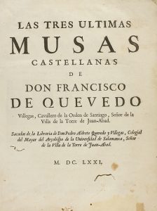 1671. - LIBRO : (LITERATURA). - QUEVEDO, FRANCISCO DE : LAS TRES ULTIMAS MUSAS CASTELLANAS DE... Salamanca : Libr. Don Pedro Aldrete, 1671. 8º mayor. 6 h. + 200 p. + 2 h. + 86 p. + 9 h.