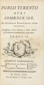 1753. - LIBRO : (LITERATURA CLÁSICA). - TERENTII AFRI, PUBLII : COMEDIAE SEX, AD OPTIMORUM EXEMPLARIUM FIDEM RECENSITAE. Lutetiae Parisiorum [París] : Ed. Natalem le Loup & Jacobum Merigot, 1753. 2 vol. 8º menor.