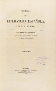 1851-1856. - LIBRO : (LITERATURA). - TICKNOR, M. G. : HISTORIA DE LA LITERATURA ESPAÑOLA. Madrid : Imp. de la publicidad, 1851. 4 vol. en 8º mayor.