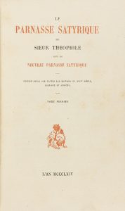 1864. - LIBRO : (LITERATURA FRANCESA). - LE PARNASSE SATYRIQUE DU SIEUR THEOPHILE. S.l. : S. imp. , 1864. 2 vol. 8º. I : 216 p. II : 245 p. 2 vol. enc. en media piel, puntas, nervios, cortes superiores dorados. Lomos algo rozados.