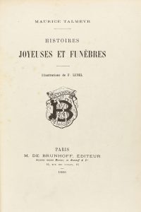 1886. - LIBRO : (LITERATURA). - TALMEYR, MAURICE : HISTOIRES JOYEUSES ET FUNÈBRES. París : Ed. M. De Brunhoff, 1886. 4º menor. 94 p. + 4 dibujos en el texto.
