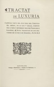 1906. - LIBRO : (LITERATURA). - EXIMÈNIÇ, FRANCESCH : TRACTAT DE LUXURIA. CAPÍTOLS TRETS DE ´LO TERÇ DEL CRESTIÀ´, MS. INÈDIT, EN LO XIV EN SEGLE. NOVA TRADUCCIÓ DE LES HISTORIES DE LOTH E DE SUSANNA. Barcelona : Ed. Stampa...