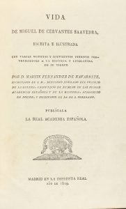 1819. 8º. 643 p. ilustr. con un retrato grabado al acero de B. Atmetller y 4 láms. plegadas con el facsímil de una carta manuscrita de Cervantes y su árbol genealógico.