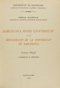 1938. - LIBRO : (BARCELONA). - SOLDEVILA, FERRAN : BARCELONA SENSE UNIVERSITAT I LA RESTAURACIÓ DE LA UNIVERSITAT DE BARCELONA(1714-1837). - Barcelona : Tip. Emporium, 1938. 8º mayor. XXIV + 212 p., 1 h. Enc. media piel.