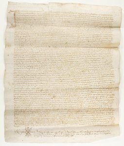 1462. MANUSCRITO : (PERGAMINO). - JOHANNES VILAR I ROIG A SU LEGÍTIMA ESPOSA DONAN LA PLENA PROPIEDAD DE UNA FINCA A SU HIJA ESPOSA A BERNARDO VINYALS. 40 x 31 cm. Manuscrito sobre pergamino. Capital ilustrada.