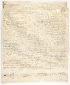 1518. MANUSCRITO : (PERGAMINO). - TESTAMENTO DE BERNARD VIÑALS. PARROQUIA DE FLASSIANO (Gerona). - 39 x 33 cm. Manuscrito sobre pergamino. Con pequeña falta que afecta el final de las primeras líneas.