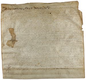 1608. MANUSCRITO : (GIRONA-SANT MARTI DE LA MOTA). - DONACION DE 25 LIBRAS EN MONEDA BARCELONESA, DE UN ARCA, VESTIDOS Y JOYAS, HECHA POR ANTONIO PRADAS, PAGES DE LA PARROQUIA DE SANT MARTI DE LA MOTA. Manuscrito sobre pergamino, 31 x 33,5 cm....