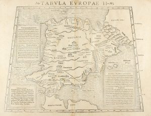 1542. MAPA : [MUNSTER, SEBASTIEN : ]. TABULAE EUROPAE II. 34 X 44 cm. Xilografía de proyección cónica. Tres cartelas : Tarraconens civitates, Lusitaniae civitates y Populi Tarraconenses. La Geographia y la Cosmographia de Munster son...