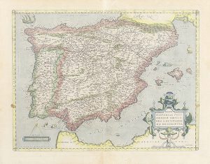 1570. MAPA : ORTELIUS, ABRAHAM : REGNI HISPANIAE POST OMNIUM EDITIONES LOCVPLETISSIMA DESCRIPTIO. [Amberes.] 38 X 50 cm. Coloreado. Cartela abajo a la derecha con escudo. Colomer, 69.