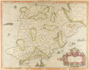 1584. MAPA : (EUROPA). - EUROPAE II TAB. 34 x 43 cm. Mapa de la península ibérica con bonita cartela ilustrada, con la leyenda : ´Medius meridianus jj., reliqui ad hunc inclinantur distantes iuxta rationem parallelorum 39 & 43, ad circulum...